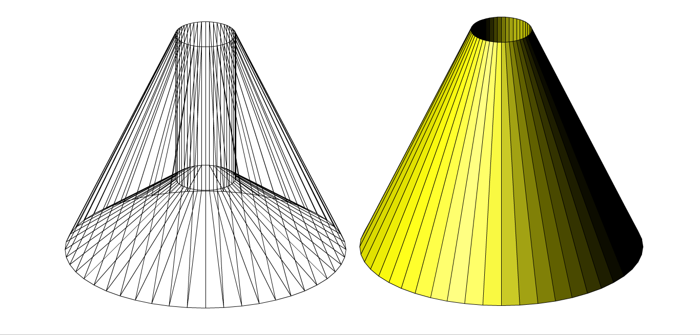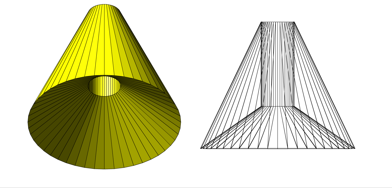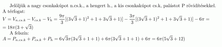 Megoldás: Előbb nézzük a térbeli ábrákat. Látható, hogy a közepe üreges. A külső nagy csonkakúpból hiányzik egy henger és egy kisebb csonkakúp.