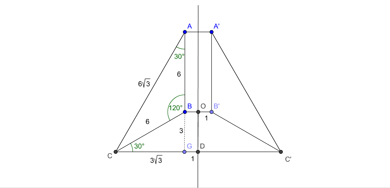 Egy egyenlőszárú háromszög egyik szöge 120°, szárai 6 cm hosszúak. Megforgatjuk a háromszöget az egyik szárával párhuzamos tengely mentén, mely a szártól 1 cm távolságra van. Számítsuk ki a keletkezett téridom térfogatát és felszínét.